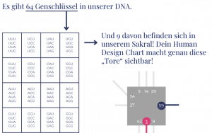 Je nachdem welcher Genschlüssel/Tor bei dir aktiviert ist, hat deine Energie eine ganz spezielle Färbung bekommen. Du erkennst eine Aktivierung daran, wenn die Zahl des Genschlüssels und der Strich dahinter farbig markiert sind.